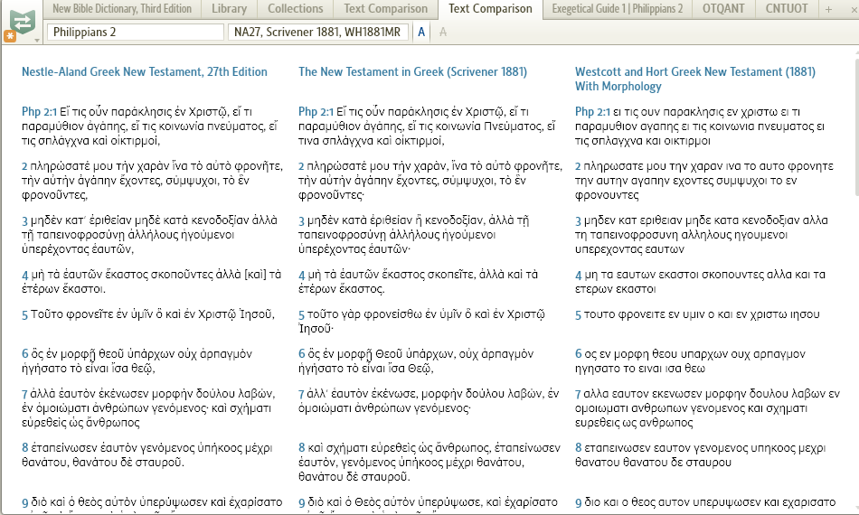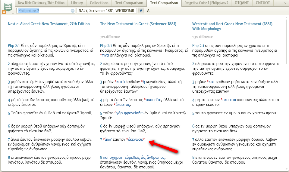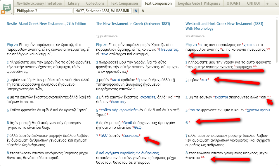 Under SR-7 I have a text comparison set up between the NA27 (base), Scrivener's, and the Westcott-Hort Greek NT. All is well until I check 'ignore marks' and select the 'show differences' view. Then, some of the Scrivener text and much of the W-H text goes missing.
