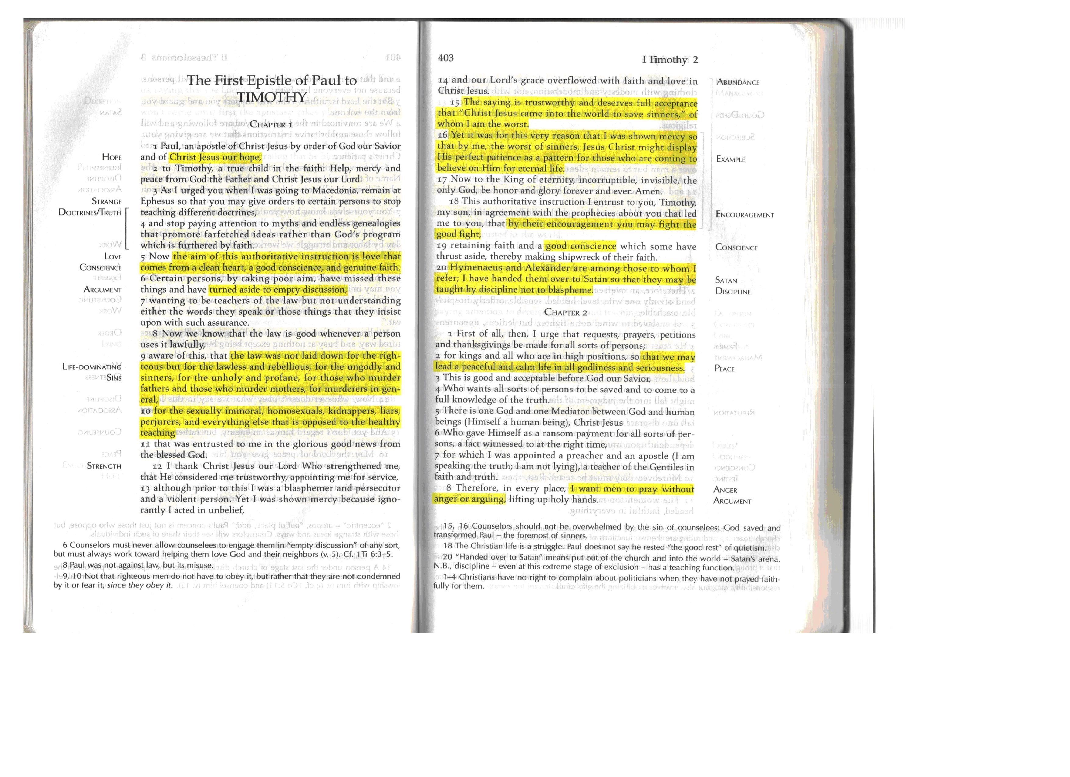 Here is a page from Jay Adams' book The Christian Counselor's New Testament and Proverbs. Does anyone have any ideas (using highlights, notes, etc.) to get this into my preferred Bible? There are too many different topics to use a different highlight for each one. If possible I would like to have all the markups under one group that I could "turn on / turn off" easily. Could I do this with visual highlights? I also wish there was a way to display the different topics in the margins of the Bible, but I don't think this is possible.
