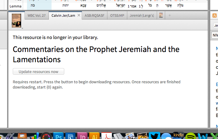 Can anyone help – I have lost, well, at least two resources Calvin commentaries series and Lange series (it might be over 100 resources). The message below shows on both but the button is greyed out so you can't use it. I am on the latest version of Logos 5 (I had to get it as it crashed when I asked to install it)
