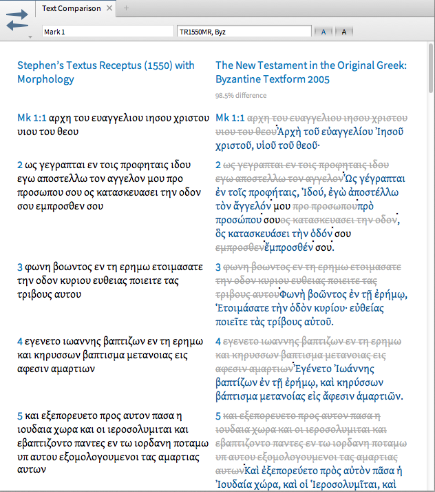 Okay, I have to admit...I've never tried to compare two Greek texts. I thought I could just open the Text Comparison panel and view them side-by-side like my English versions. This doesn't seem to be working though. I mean 98.5% difference between two "majority texts"! lol