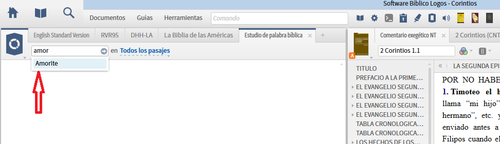 I have a spanish interface, I am doing a Estudio de Palabra Biblica (Bible Word Study) and it gives me words in English as options and not Spanish Words. I can bring up AMORITE but not AMOR.