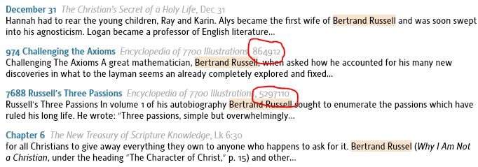 I think these are supposed to be the page numbers or location references within each book where that search hit was found. For most of the hits, the page numbers or references make sense and are within a normal range, but I'm seeing some of those weird numbers too. In Preaching the Word: Hebrews Vol 1 & 2 I'm seeing page numbers like p. 20276. If I click on that particular search hit to open that resource to that page, and turn on "Show Page Numbers" I see the weird page numbers embedded in the text, too. For the Encyclopedia of 7700 Illustrations, I'd expect that number to be the illustration number, since it doesn't have page numbers in it. Maybe it's the word number or something crazy like that.