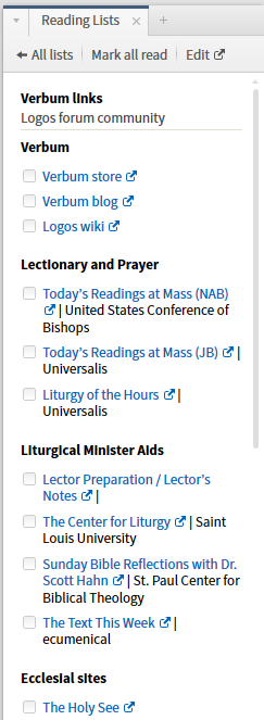 This one is built for Catholics but the pattern should be useful for other groups. This is a reading list intended to be anchored on the left side of your lectionary layout so that you have ready access to related resources. At the moment it isn't fleshed out - your input as to what you want at your fingertips is greatly needed.