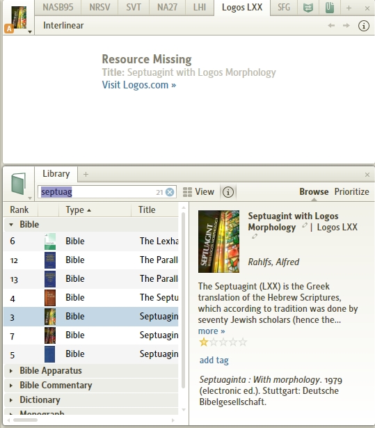 More odd behavior. Along with no Biblical People/Places/Things, and no Interlinear in my NASB, I just discoved my Septuagint won't load, even though it's still listed in my Library: