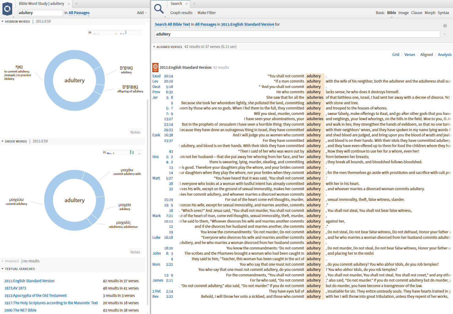 I'm sure this is doable, but is there anyway to search all the occurrences of an English word in the Greek? For example - "adultery" is found 32 times in the ESV, but several different Greek lemmas. Is there a way to list the different Greek words that are translated "adultery" in the ESV?