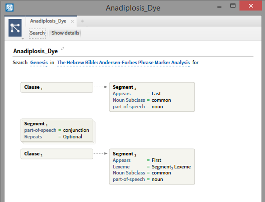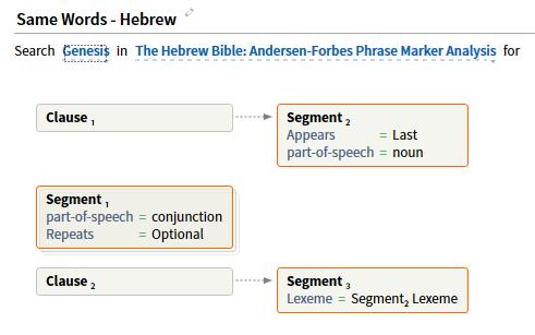 I am trying to create a syntax search to find other examples of the construction in Gen. 1:1-2, where a noun ends one verse, and the same noun begins the next verse. I know I need to use the Andersen-Forbes text, but I am lost on the details. Anyone know if this is possible?