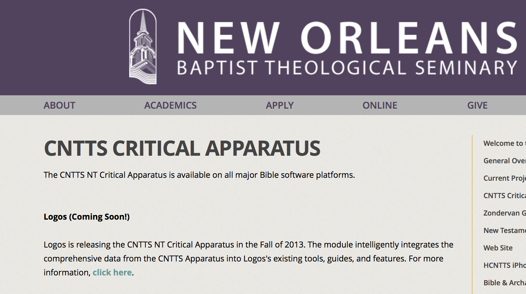 I know we are still waiting on the NA28 apparatus, and will likely continue to wait for some time. But, I wonder about CNTTS. Its natively a digital resource so the process shouldn't be as complex as a natively printed resource. NOBTS says on their site that Logos would have the resource out in the Fall of 2013.