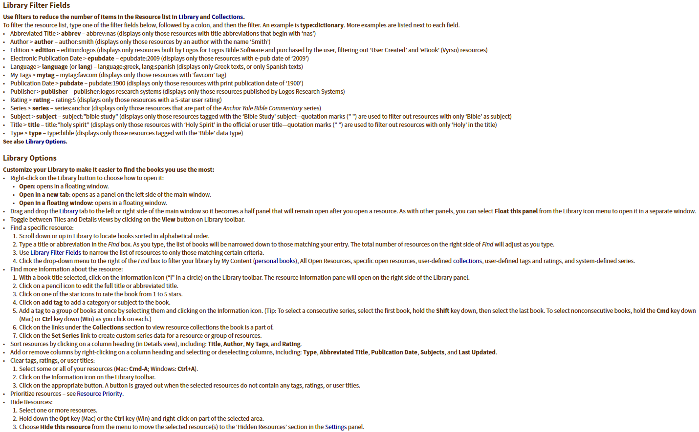 Wiki => https://wiki.logos.com/Library__#Using_the_Find_box_to_filter_your_resource_list_in_the_Library_window has many examples