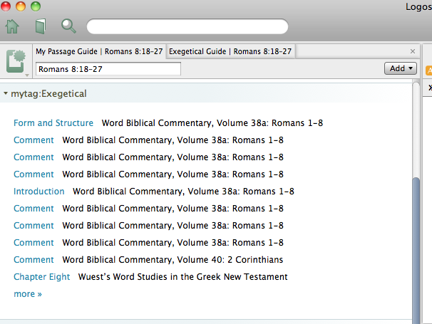 I LOVE the ability to incorporate custom collections in the PG. The only problem is that it does not work well when doing custom collections of commentaries. Logos, can we please have an option to create a custom commentary section in the PG where the search results are versified rather than searching the commentary for every single occurrence of a verse? (see below for how this currently works)