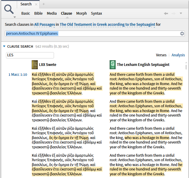 Clause search for the Hebrew Bible and Greek New Testament was introduced with Logos 5. This feature allows the user to specify grammatical and syntactic criteria along with referent data in a search query. This capability now includes the Apocryphal and Deuterocanonical books contained in H.B. Swete's edition of the Septuagint. Further, clause search supports searching by referent, so this material can now be searched for all instances of Antiochus IV Epiphanes, whether he is explicitly stated or not.