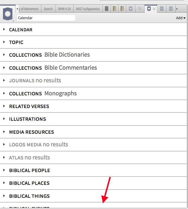 I can see Biblical Events here in the Topic Guide (this is actually my customization of the Topic Guide, which I call Topic Guide Expanded), but I cannot scroll down to see it. If I click on it to expand it, it expands, but I STILL cannot scroll down to see it. And I know there are more sections underneath Biblical Events.