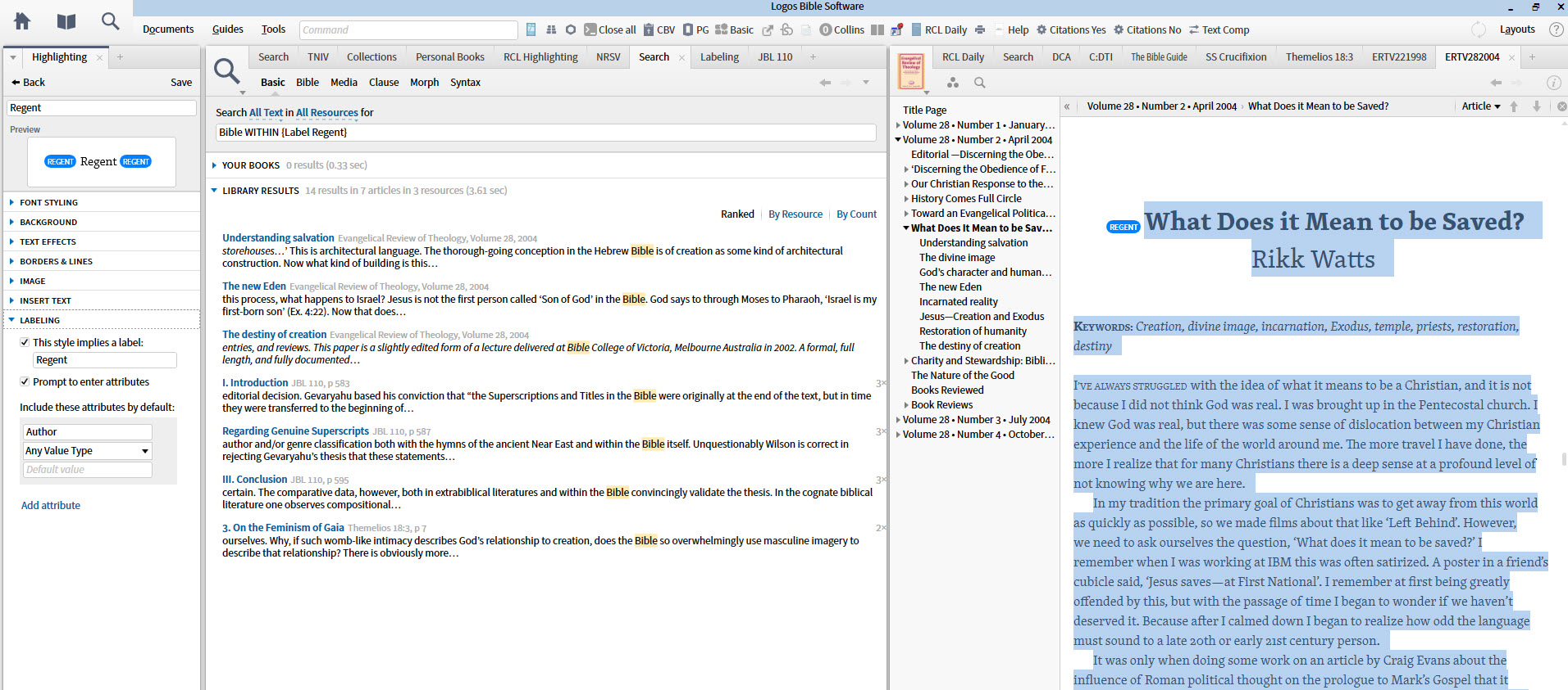 Example. I've set up this label "Regent" so I can mark sections of resources that are written by Regent College professors. I have one attribute "Author" which is set to the name of the professor in question. I'm beginning to highlight journal articles and chapters within longer books and such which are authored by Regent profs and then labeling them accordingly.