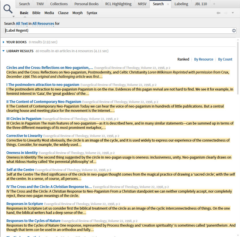 Now when I search through my entire library for {Label Regent} it finds all these articles, but it breaks them down into "articles" (a smaller unit that Logos divides resources into which does not usually correspond to a complete journal article). So I'm getting 40 hits when I do this search, and I would like to get only 4 for the 4 chunks I've labeled.