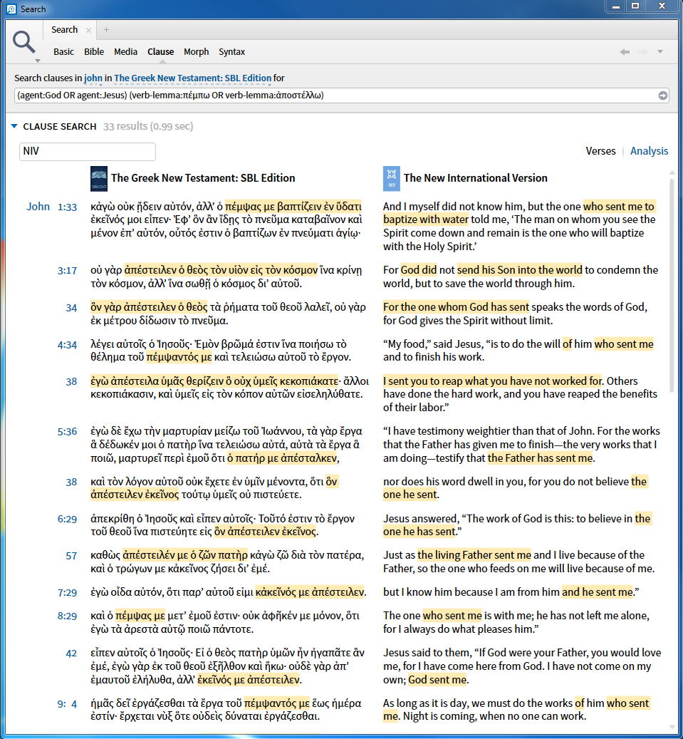 This was the second time I used this feature in Logos and afterwards I checked the results with BibleWorks. In both cases Logos wasn’t able to find any/all instances that I found using much cheaper BibleWorks. It is frustrating to know that Clause Search is not reliable.