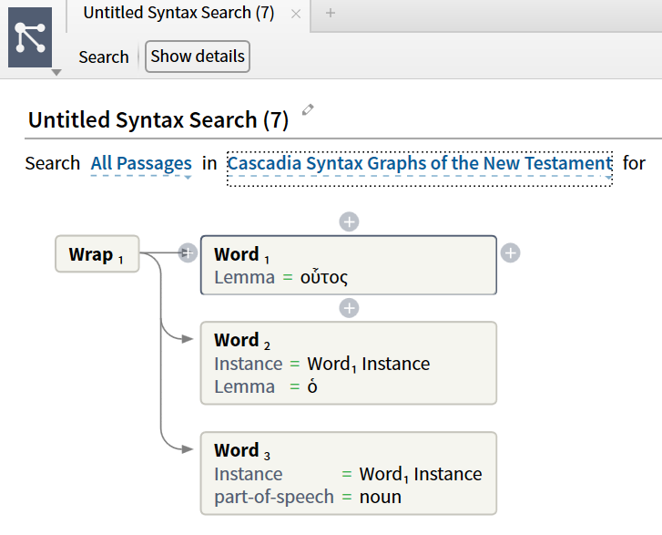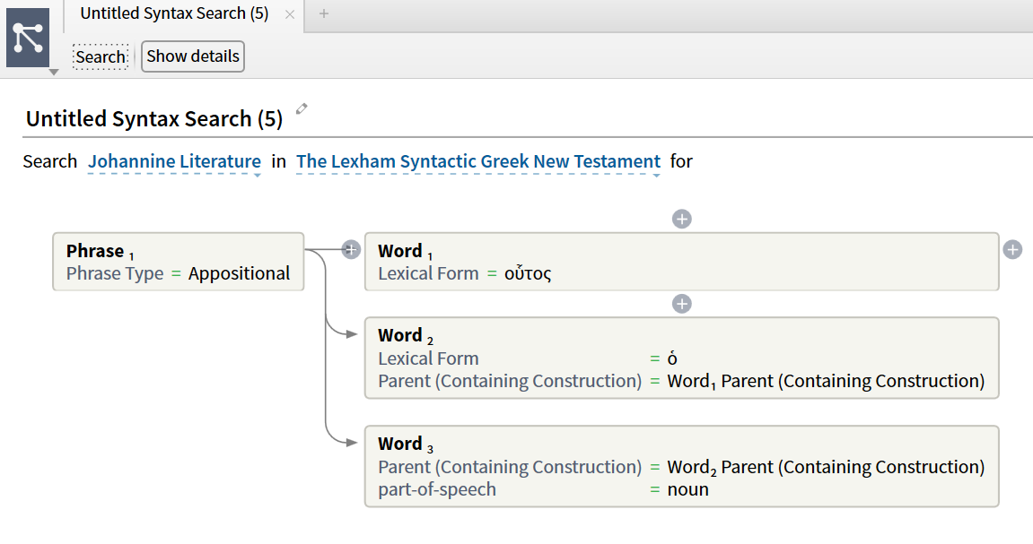 My objective: find all locations in Johannine literature where the sequence “near demonstrative pronoun” + “article” + “noun” appears, consecutively, each agreeing in form. So I tried to construct a syntax search. None of the searches I attempted found any results, though I know they exist (e.g. John 8:23 - τούτου τοῦ κόσμου). One of the challenges is that the videos I found seemed to be mostly from L4, some from L5, and best I can tell L6 has changed the UI for this. Beyond that, they still have the problem of being more tutorial-oriented than principal oriented. In other words…