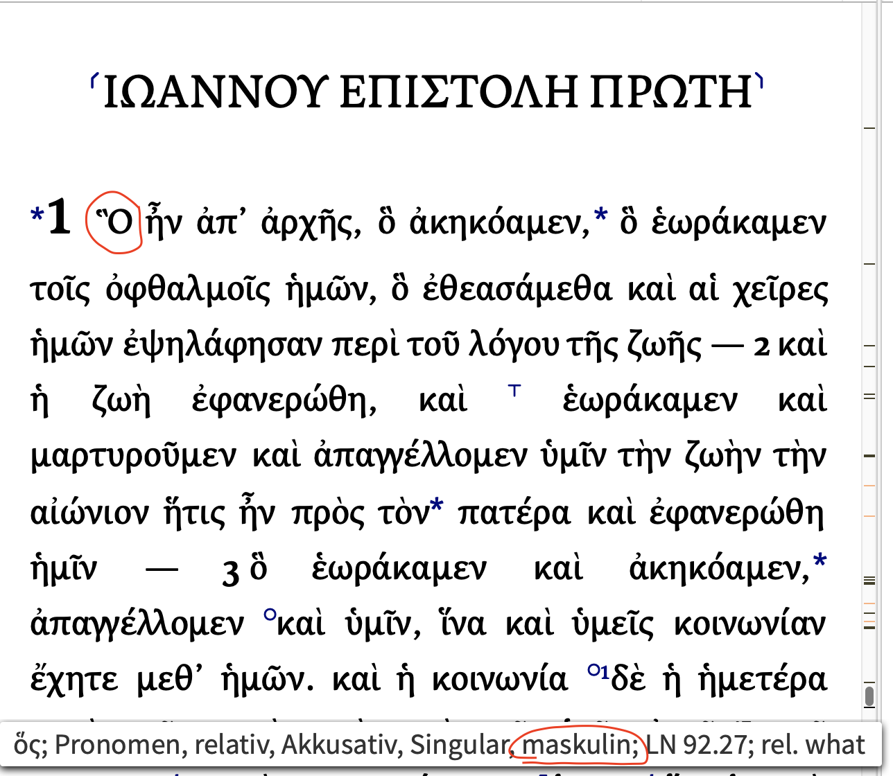In 1Jo 1:1 (NA28) wird z.B. ὃ als maskulines Relativpronomen geparst: