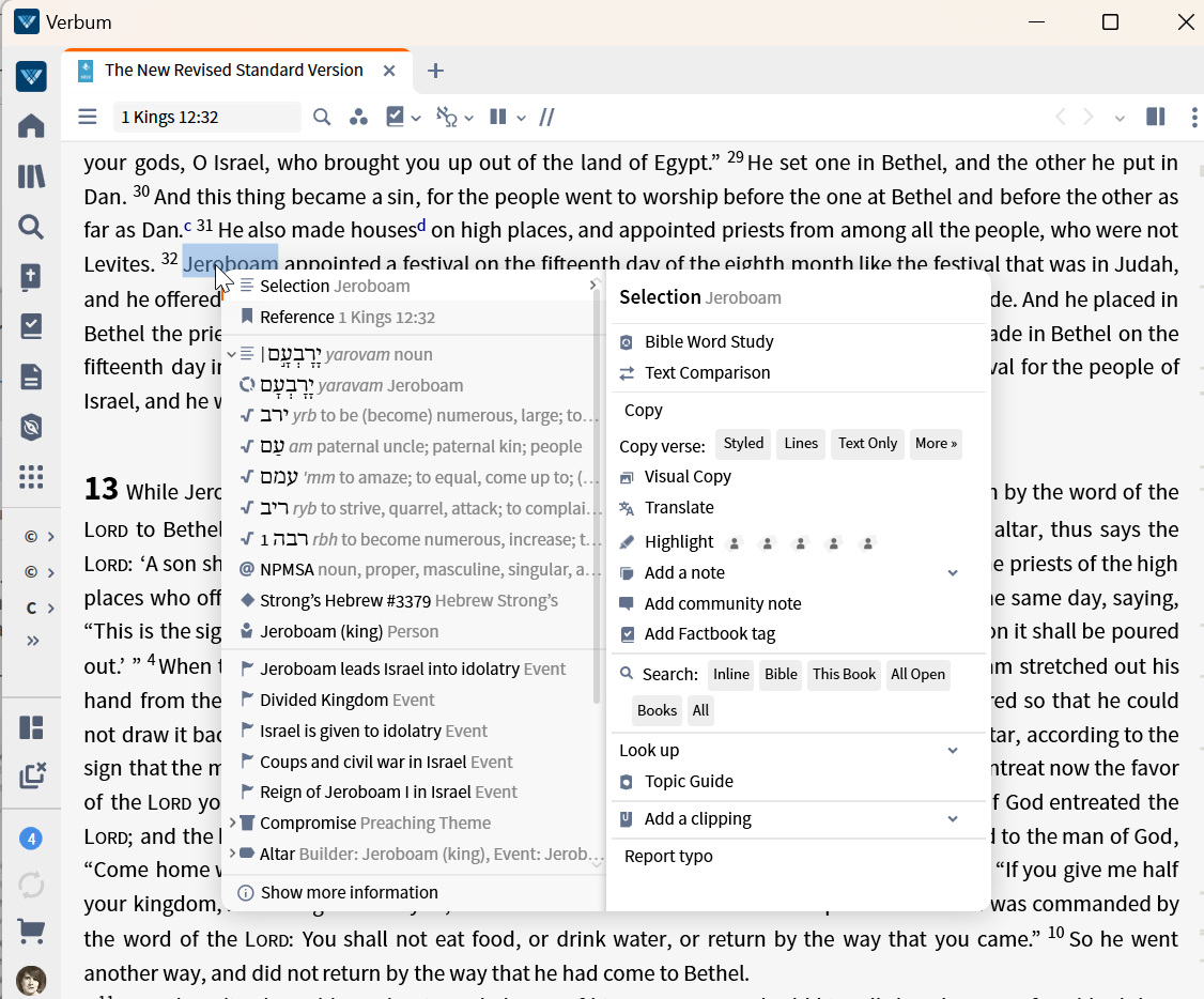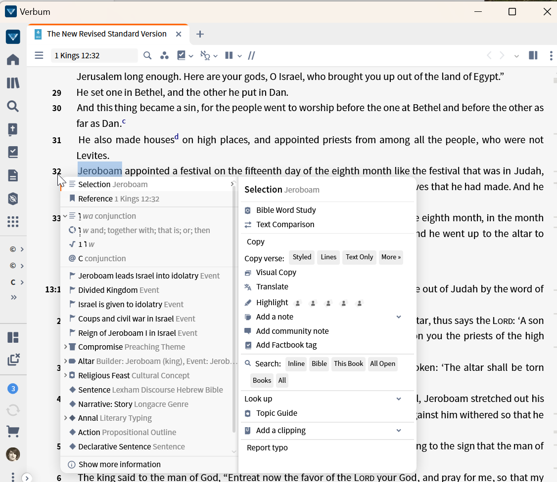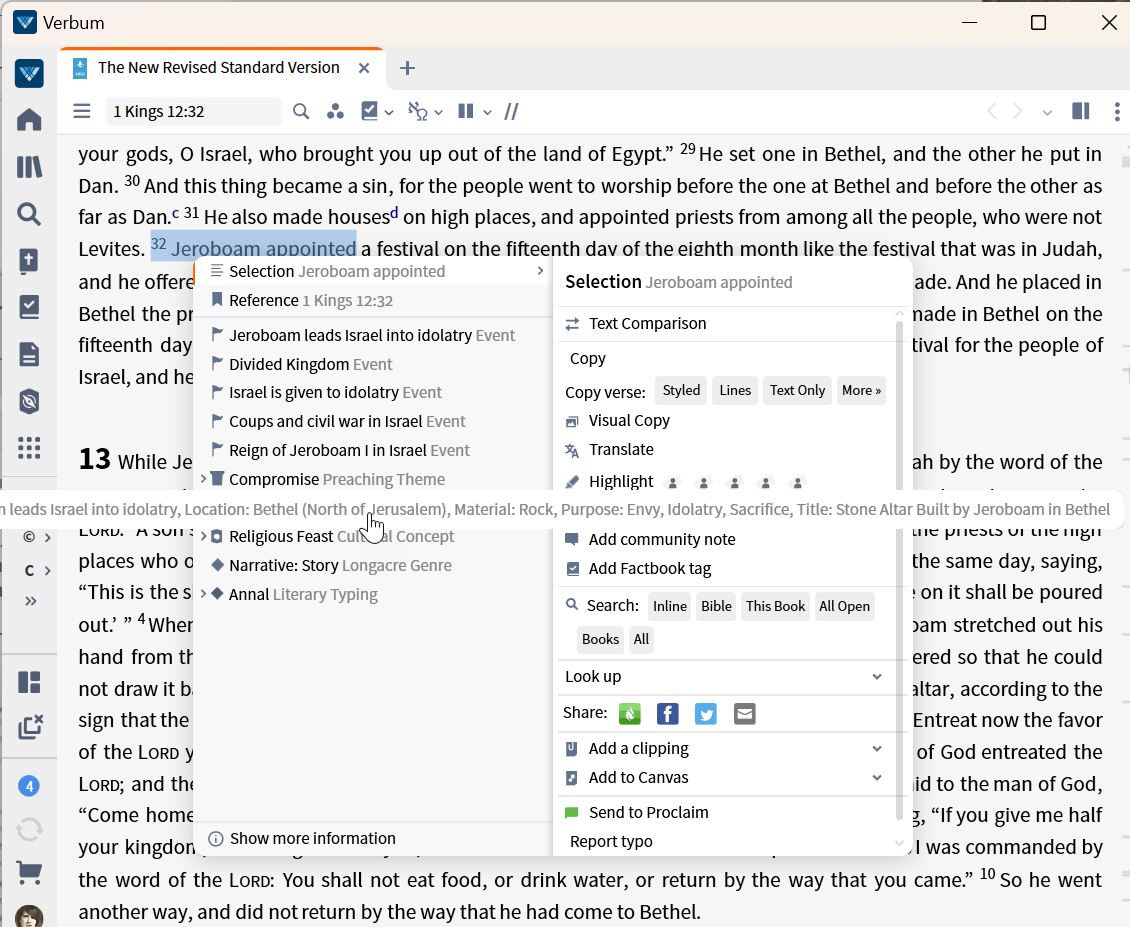 But if I include the leading space or the space and verse number, the context menu is stripped of much of its content. This is a serious problem in terms of building user expectations and trust so that the app is understandable -- and it terms of the user finding tagging information outside of an unnecessary search.