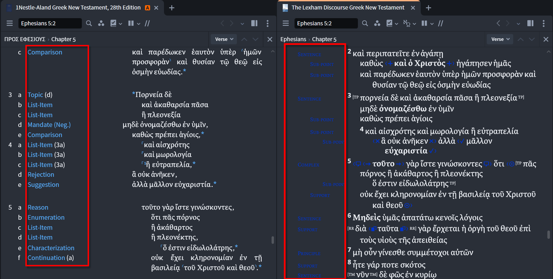 Any chance we could get the bright blue color from the Propositional Outline visual filter to be applied to the the labels in Lexham Discourse Greek/Hebrew Bibles? See for comparison, but the Propositional Outlines are so much easier to see in dark mode.