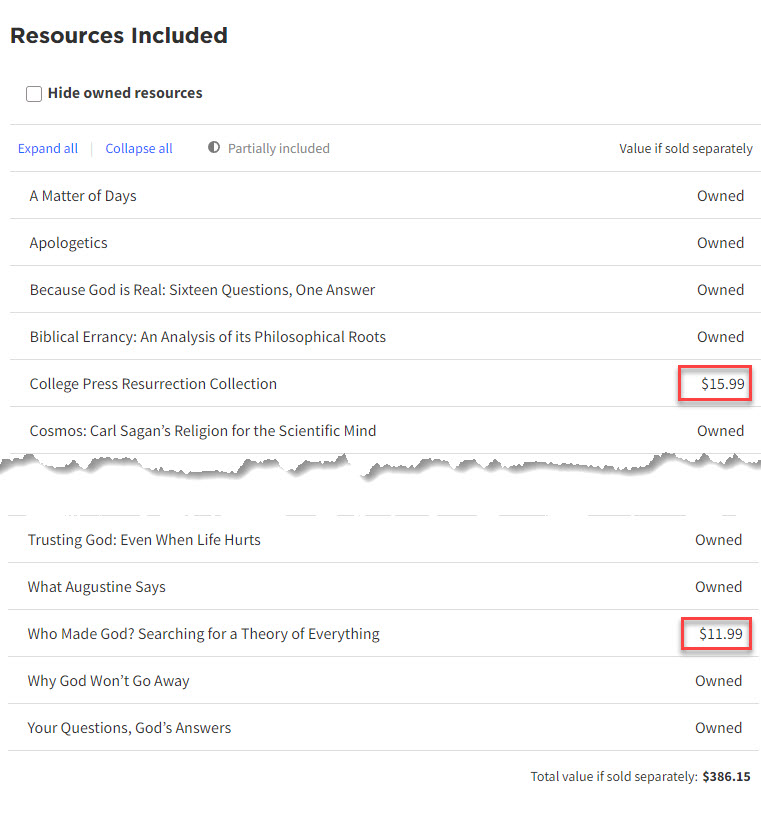 When I click "Hide owned resources" on this collection, it shows nothing available that I don't own already in this collection, but it still has a price.