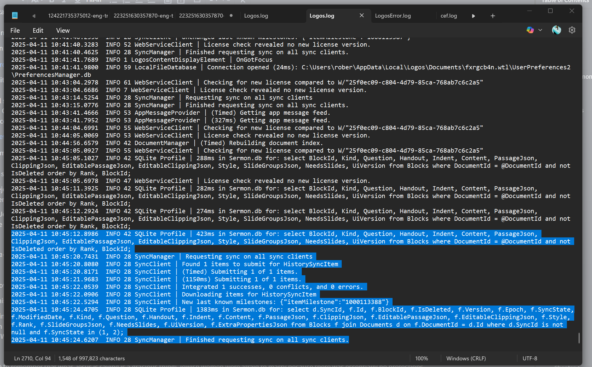I wrote a "Discussion" post earlier today but it was flagged as needing review (not sure why, and why that review never happened), so I am trying again as a "Question" post. Logos has been extremely laggy all day (working mostly on Sermon Editor, not many other tabs or applications open). The application freezes/grays out for minutes at a time. I can barely get any work done in between. I have lost a lot of time today, and I don't know how I am going to get my sermons done in Logos this week. I may have to switch to Word. PLEASE FIX THIS SOON! This is extremely debilitating.