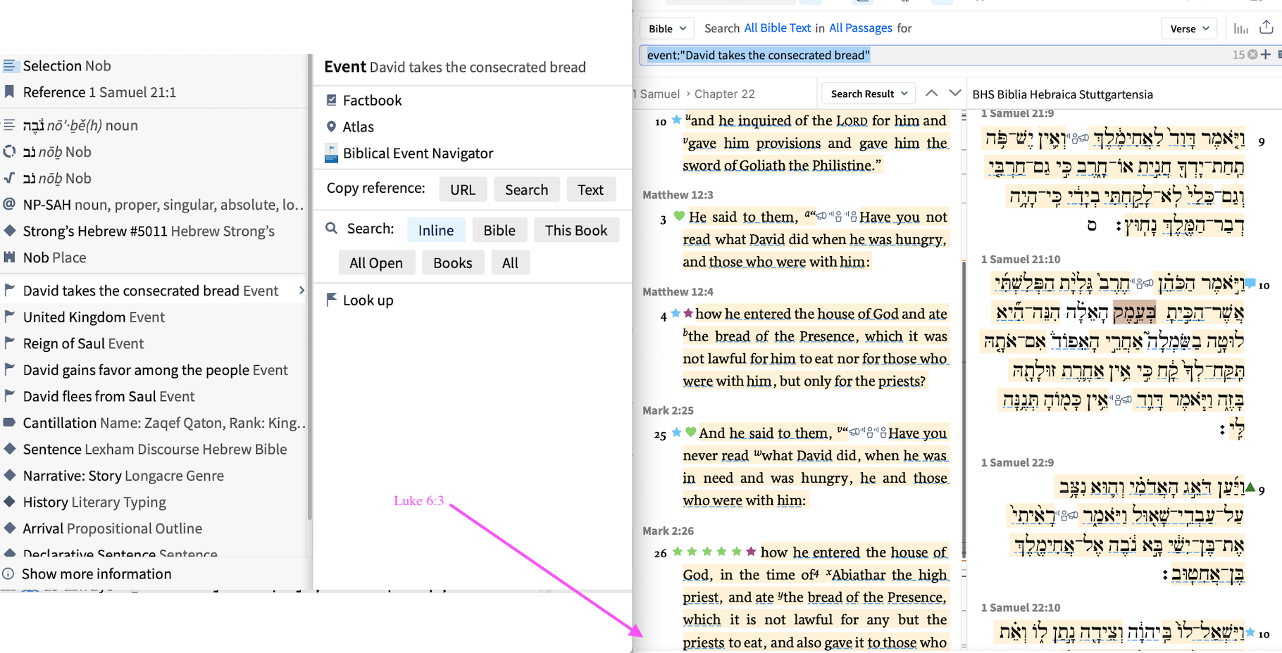How do I suggest an "event" when searching? I am not sure what the correct lingo is, so I will attach a screenshot. Searching for the David and the bread situation, Logos says that it occurs in the NT in Mt and Mk, but it also occurs in Lk 6:3, which is not showing up.