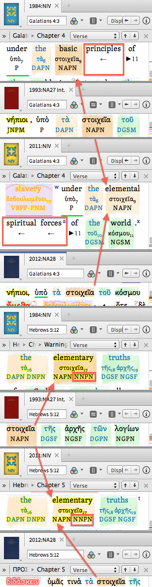 For example, in Colossians 2:8 στοιχεῖα is translated as elemental spirits (LEB, ESV, NRSV), spiritual powers (NLT), basic principles (NIV84), or elemental spirital forces (NIV11) ,etc. In each case the noun in Greek is aligned with the first word of the translation phrase, and not the noun. This is potentially confusing to those who don't know Greek well, and annoying to those of us who know it somewhat.