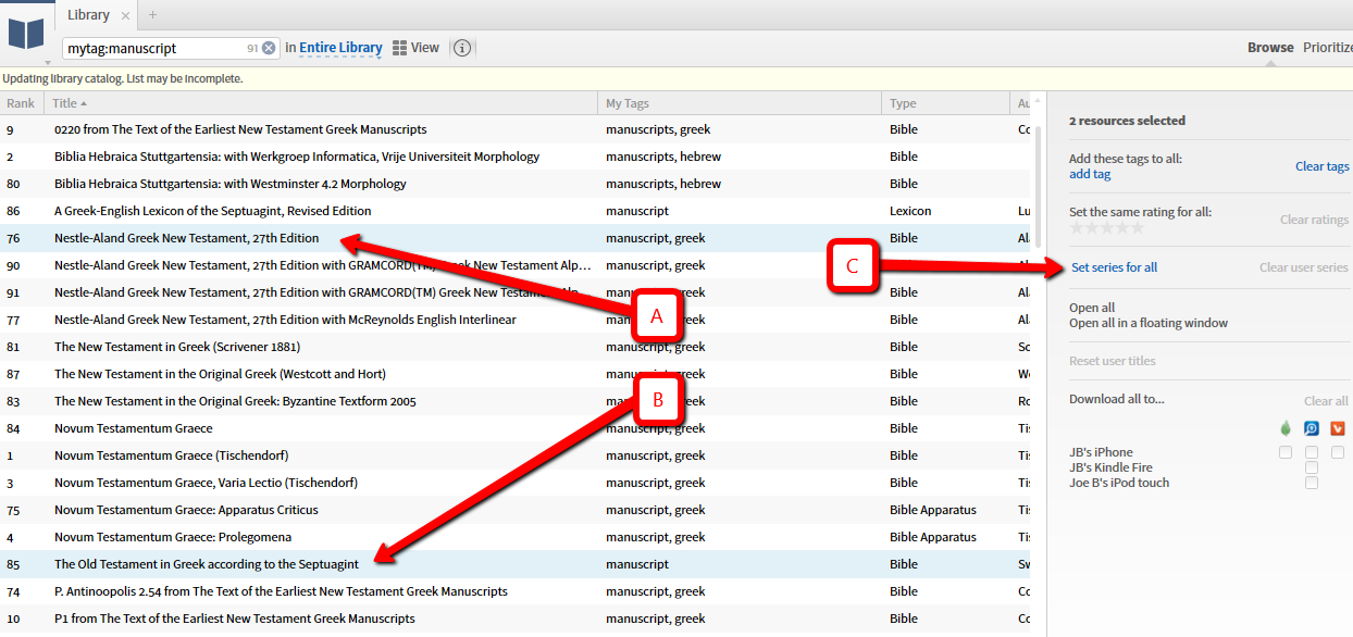In the sidebar, where it says 'Set series for all', I clicked that and typed in my series name: 'OT-NT-manuscript' (C).