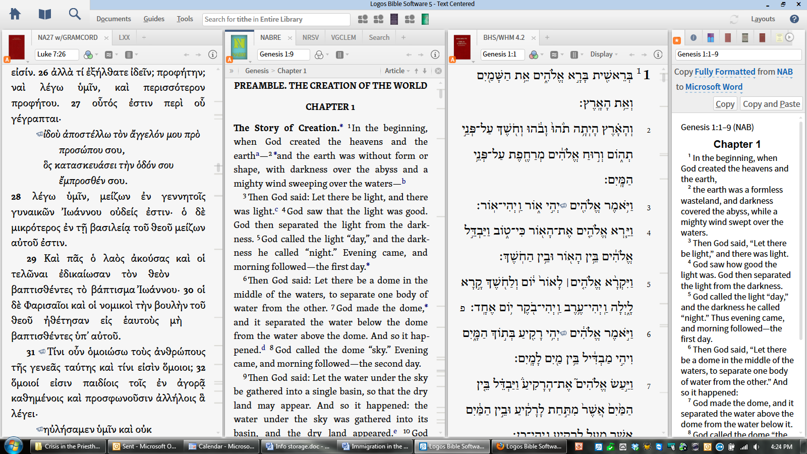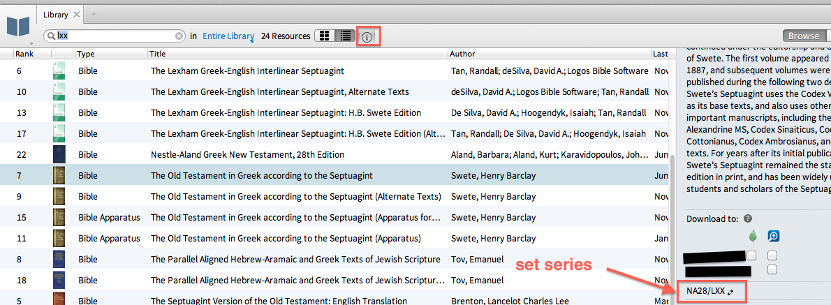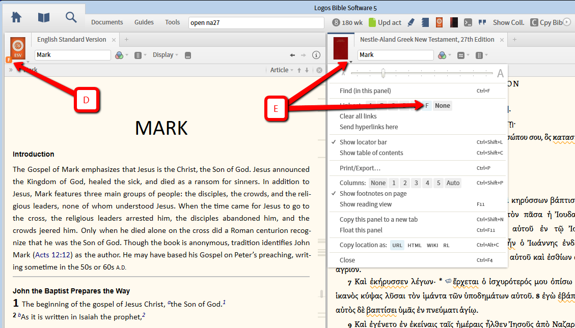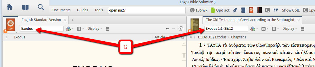 I’m an intense original biblical language user. Way back (as I have been using Logos for a long time) it used to be that I could set up two columns, one column with my English version of the Bible, and another column with both the NA27 and the LXX in separate tabs, all linked. As I moved from the Old to the New Testament in my English version, the appropriate Greek New (NA27) or Old (LXX) version would pop up automatically. Is there anyway that functionality could be restored to the last updated version of Logos 5? If you look at the image below, at the left 2 columns, you can see that though in Genesis in the English version, we’re still in the NA27 in column one. There was a time when the left column would have immediately shifted to the second tab (Version 4? Version 3? – don’t remember). Is there a way in Logos 5 to get the same functionality? -- Patrick