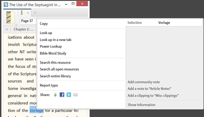 I am reading a book currently for which I have been looking up technical terms to refresh my memory. The problem is that while I do have a dictionary that provide definitions for these, it does not come up. I get sent to a blank power look-up window or occasionally to an alternate resource I don't want (the pulpit commentary index). Indeed, when looking up the word in the context menu, it can be seen that there is no link to dictionaries: