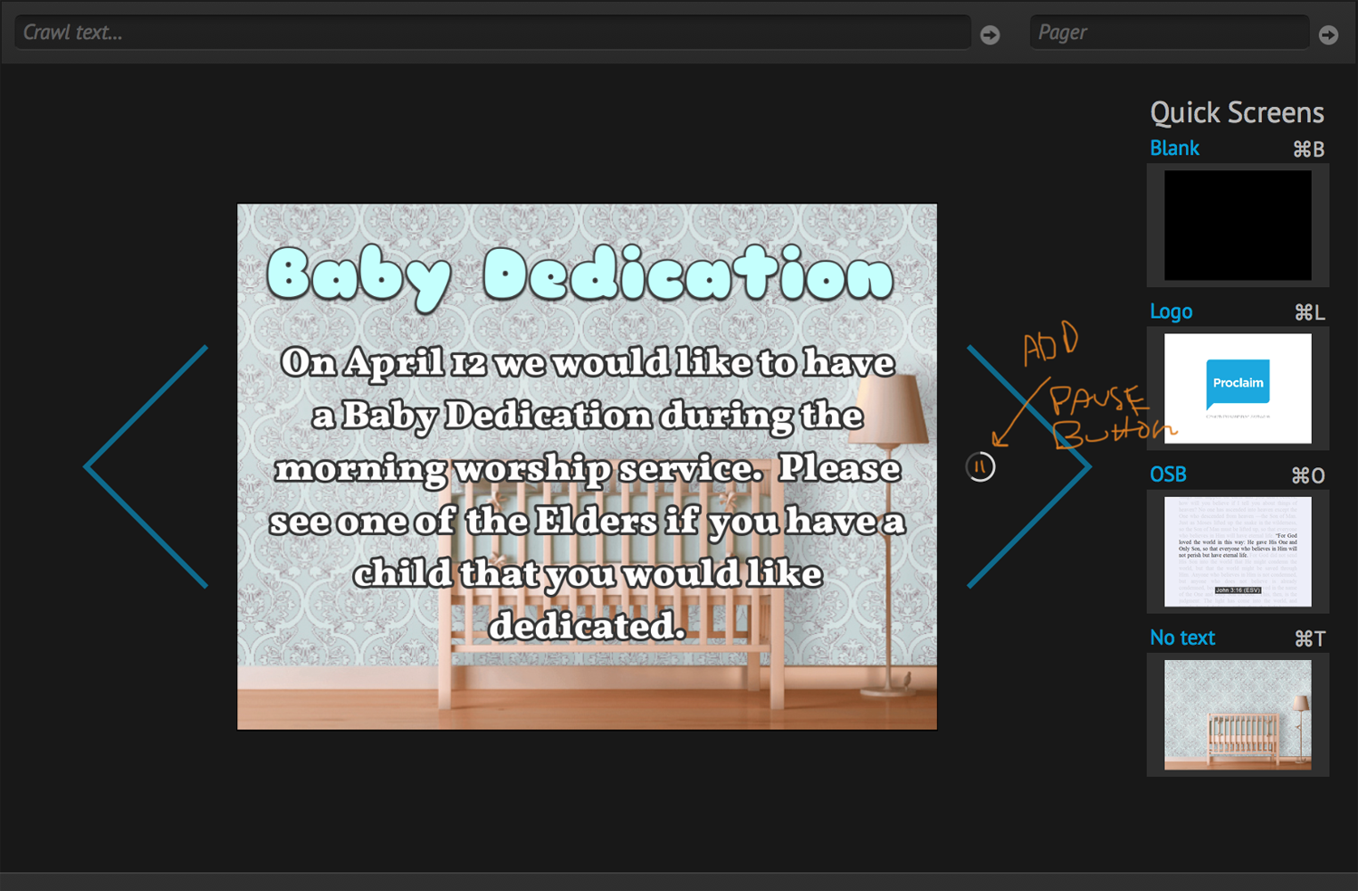 First off, thank you for all you do to make Proclaim an awesome presentation solution! I've been using it for two years, and have enjoyed it from the start. I have a request: Could you add a pause button to the "scrolling slides"? My problem is that I make announcement slides and I love that they scroll before the service, but then I also click on them during the service to put the slide back up while our speaker is giving the specific announcement. I prefer to not have to make two sets of the same announcement slides as this almost doubles the amount of slides in my sidebar and makes things seem more complicated than they are. (Often times the one making the presentation is not the one operating it, so simple is better, less slides = simple.