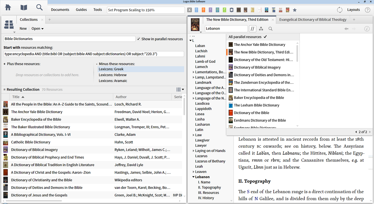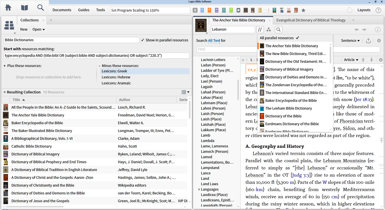 You can see in the screenshot below that my "Bible Dictionaries" collection is not appearing on the Parallel Resource menu in the AYBD, despite there being many resources in the collection that contain the article, and despite "Show in parallel resources" being selected.