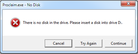 Today, when I went to upload some PPT slides, to a new presentation, I received a Proclaim - No Disk Error with options to Cancel, Try again or Continue (see attached screen shot). It referenced drive D (a thumb drive) to which I had previously downloaded a presentation backup, but which was no longer associated with a physical device. Clicking Cancel kept producing the error message as did the Try again option. Clicking Continue kept producing the error message but after several clicks produced a file system dialog box from which I could select the correct path. It should have given me a dialog box as soon as I clicked Continue or canceled the upload operation upon clicking Cancel consistent with other application programs.