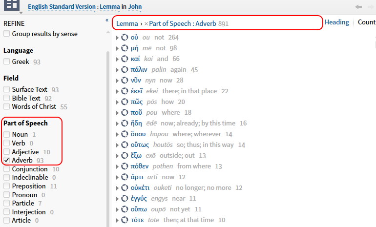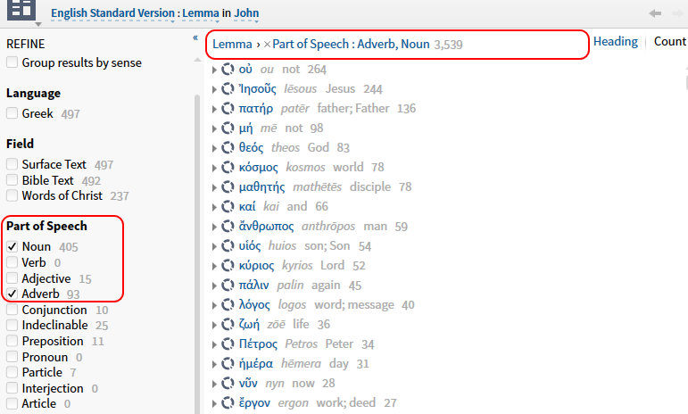 Here's the second image, where I had clicked the part of speech "Adverb." Note that the number of adverbs matches the count in the first image, as expected; and the count of nouns has changed to 1. To me that implies that there is a single adverb which is functioning as a noun in John.
