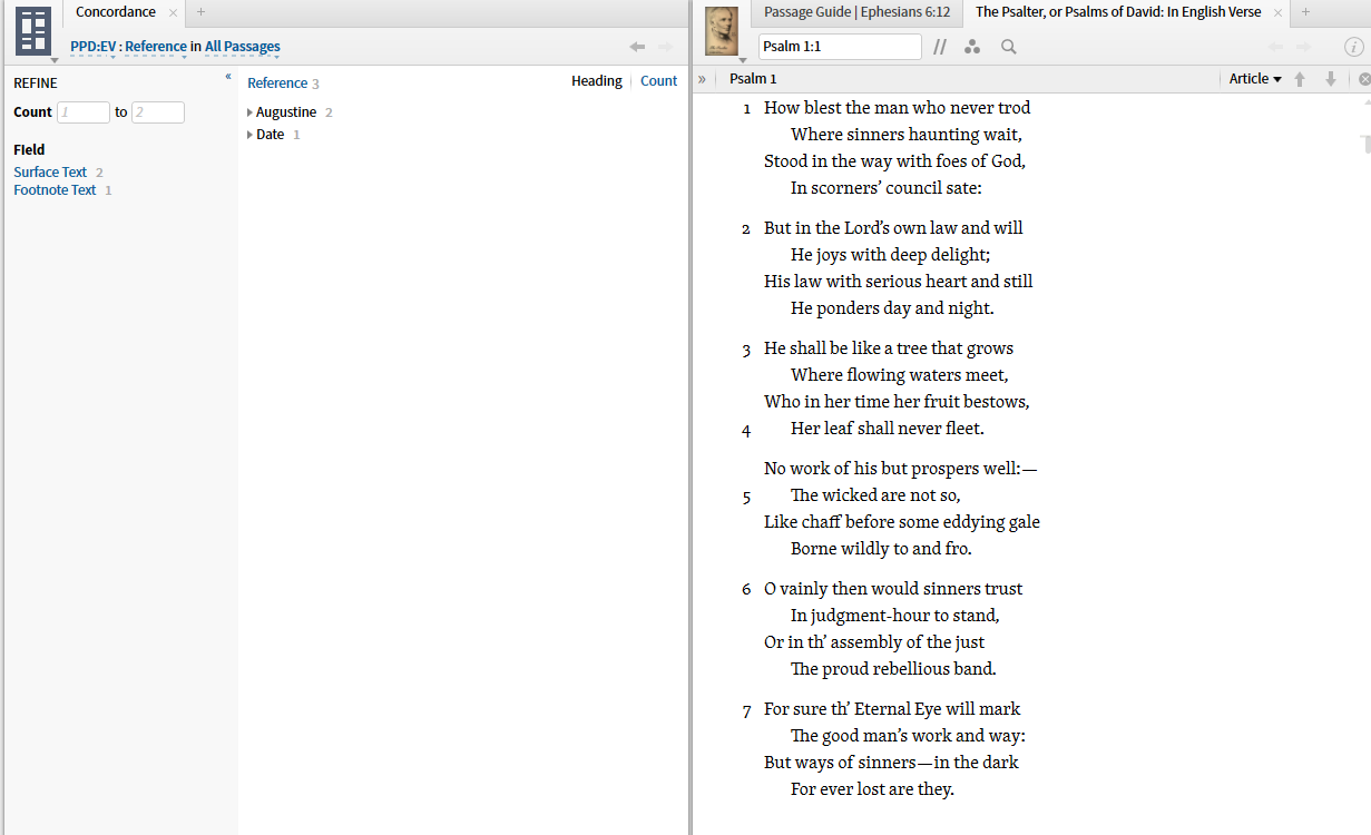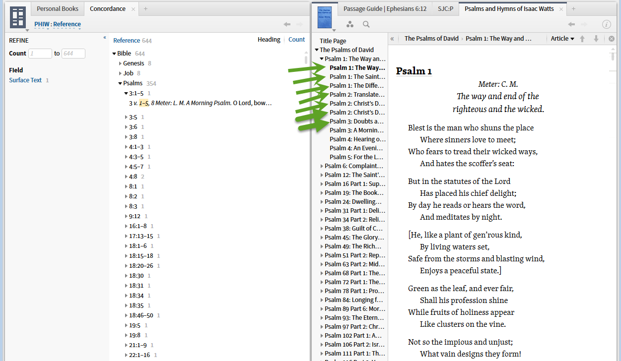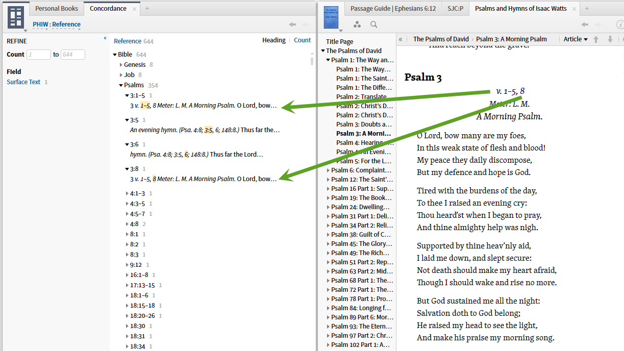 This results in a bizarre situation of a concordance run on Watts, Isaac. The Psalms and Hymns of Isaac Watts. Oak Harbor, WA: Logos Research Systems, Inc., 1998.