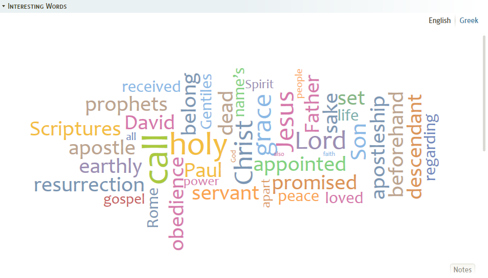 In the thread which I referred you to earlier (http://community.logos.com/forums/t/10442.aspx), Esther Jones has a good suggestion: try looking at the "Interesting Words" section of a Passage Guide. It will show you the relative frequency of keywords in that passage. The larger the font, the more frequently that word appears in your passage. So for example, in Romans 1:1-7, the Interesting Words "wordle" you get is this: